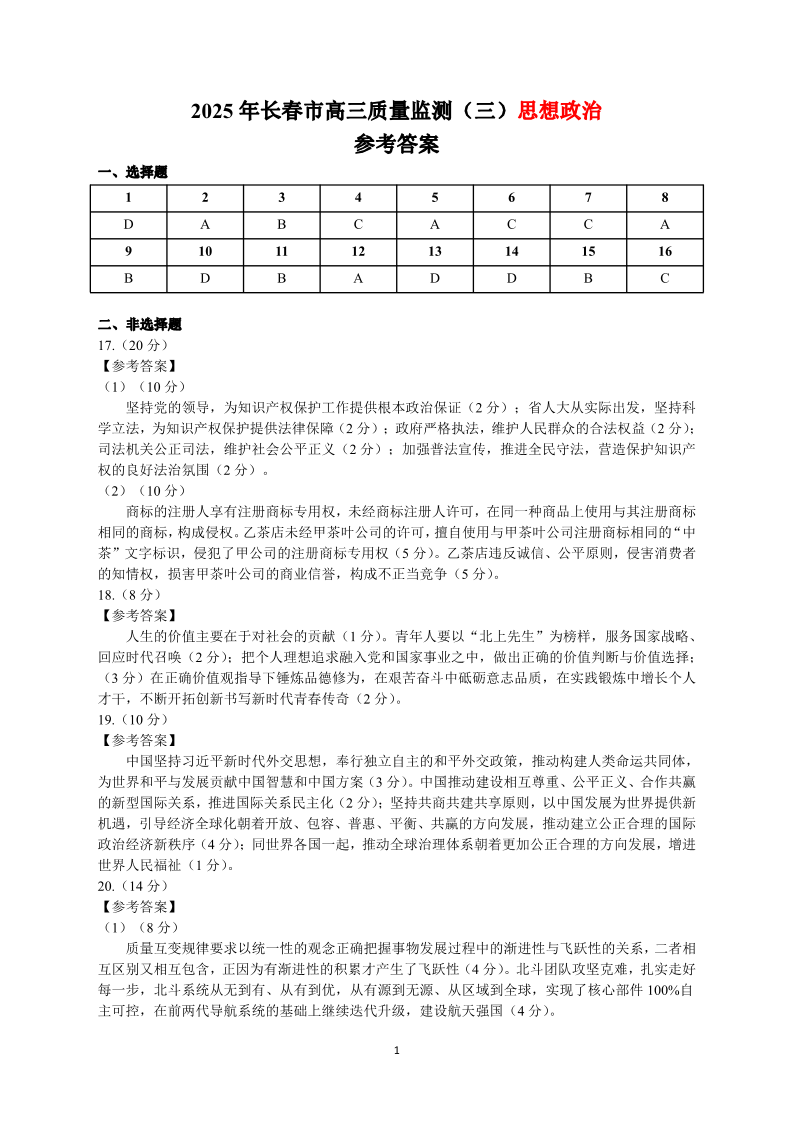 吉林省长春市2025-2025学年下学期高三质量监测(三模)政治答案