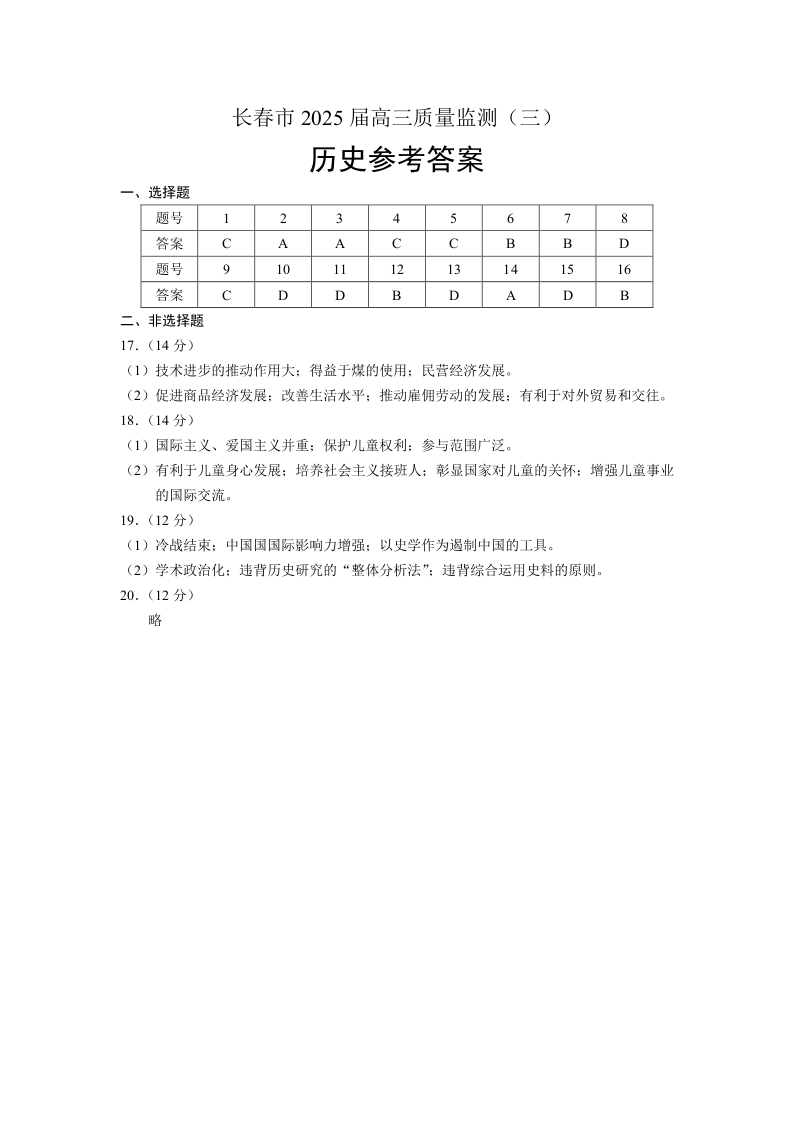 吉林省长春市2025-2025学年下学期高三质量监测(三模)历史答案