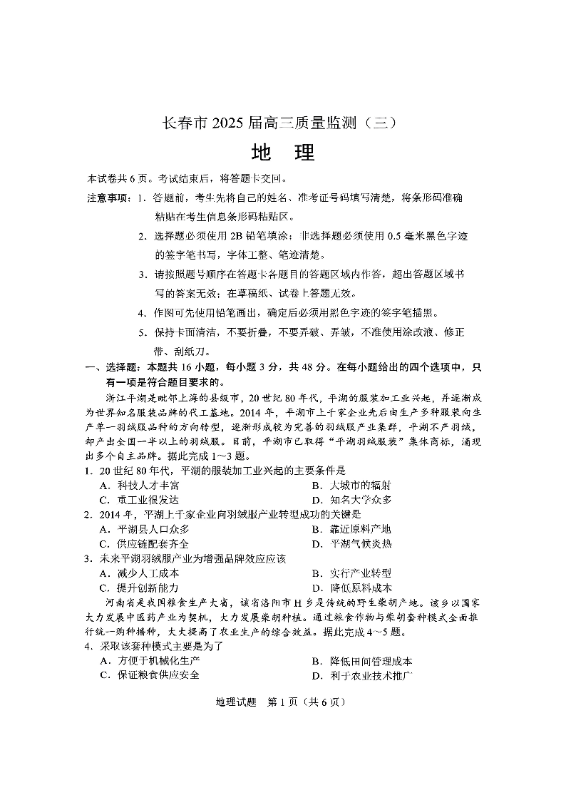吉林省长春市2025-2025学年下学期高三质量监测(三模)地理