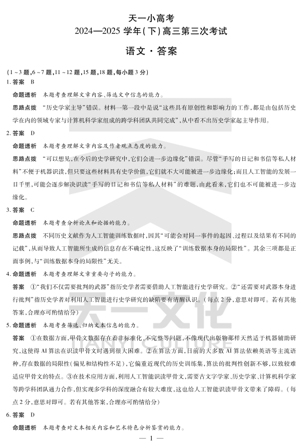 河南省天一小高考2024-2025学年(下)高三第三次考试语文答案