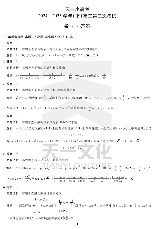 河南省天一小高考2024-2025学年(下)高三第三次考试数学答案