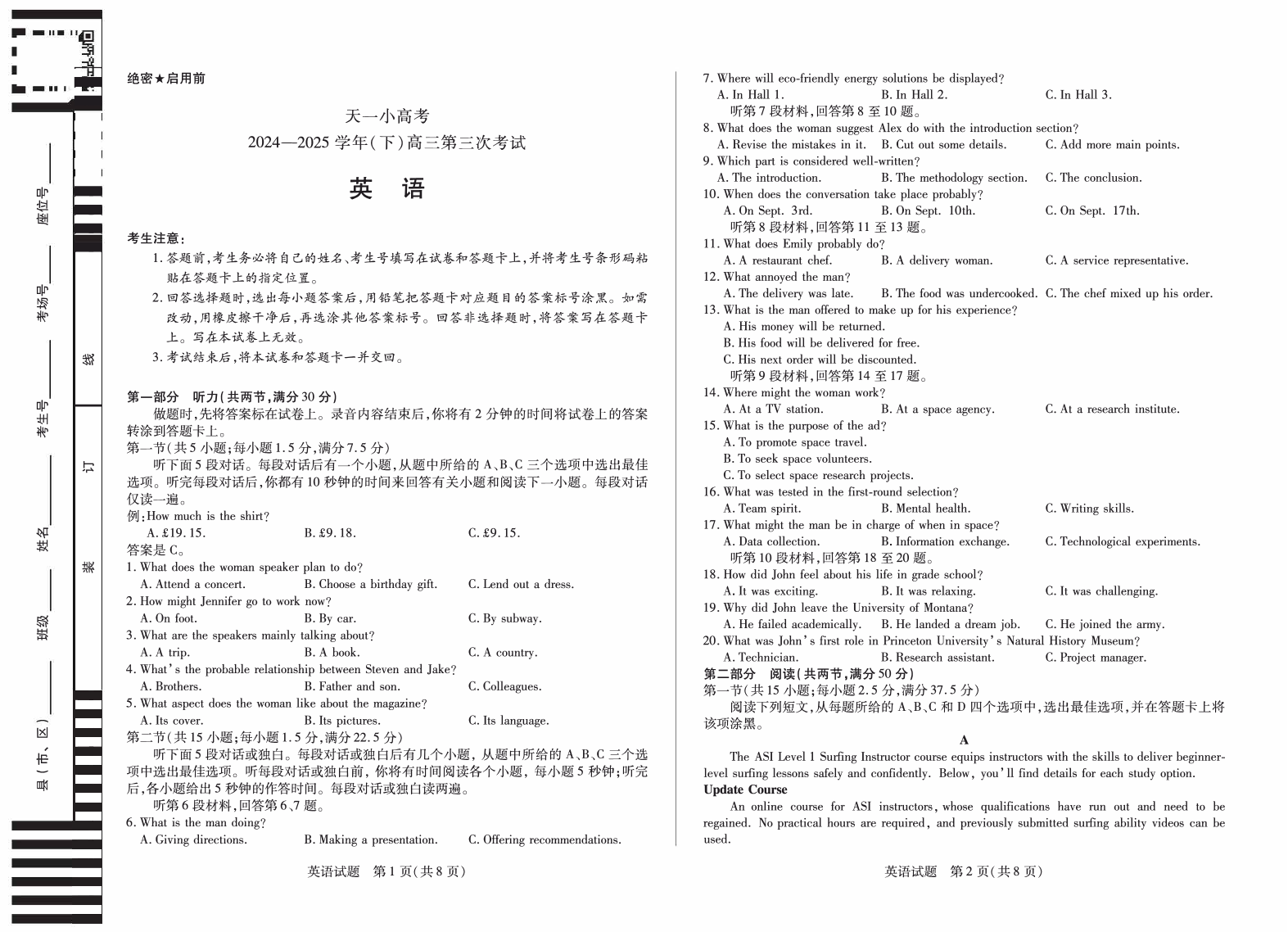 河南省天一小高考2024-2025学年(下)高三第三次考试英语