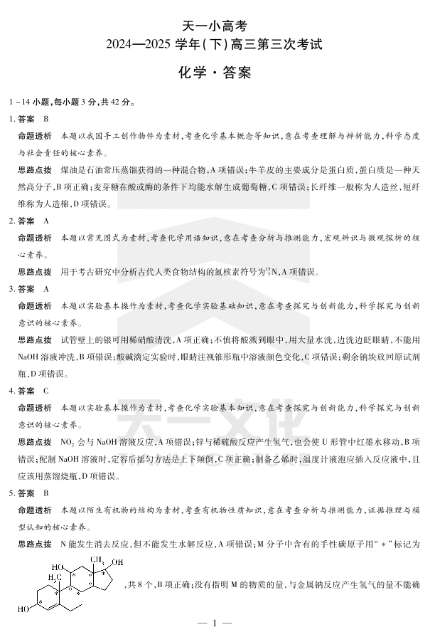 河南省天一小高考2024-2025学年(下)高三第三次考试化学答案