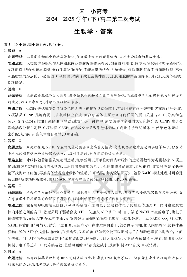 河南省天一小高考2024-2025学年(下)高三第三次考试生物答案