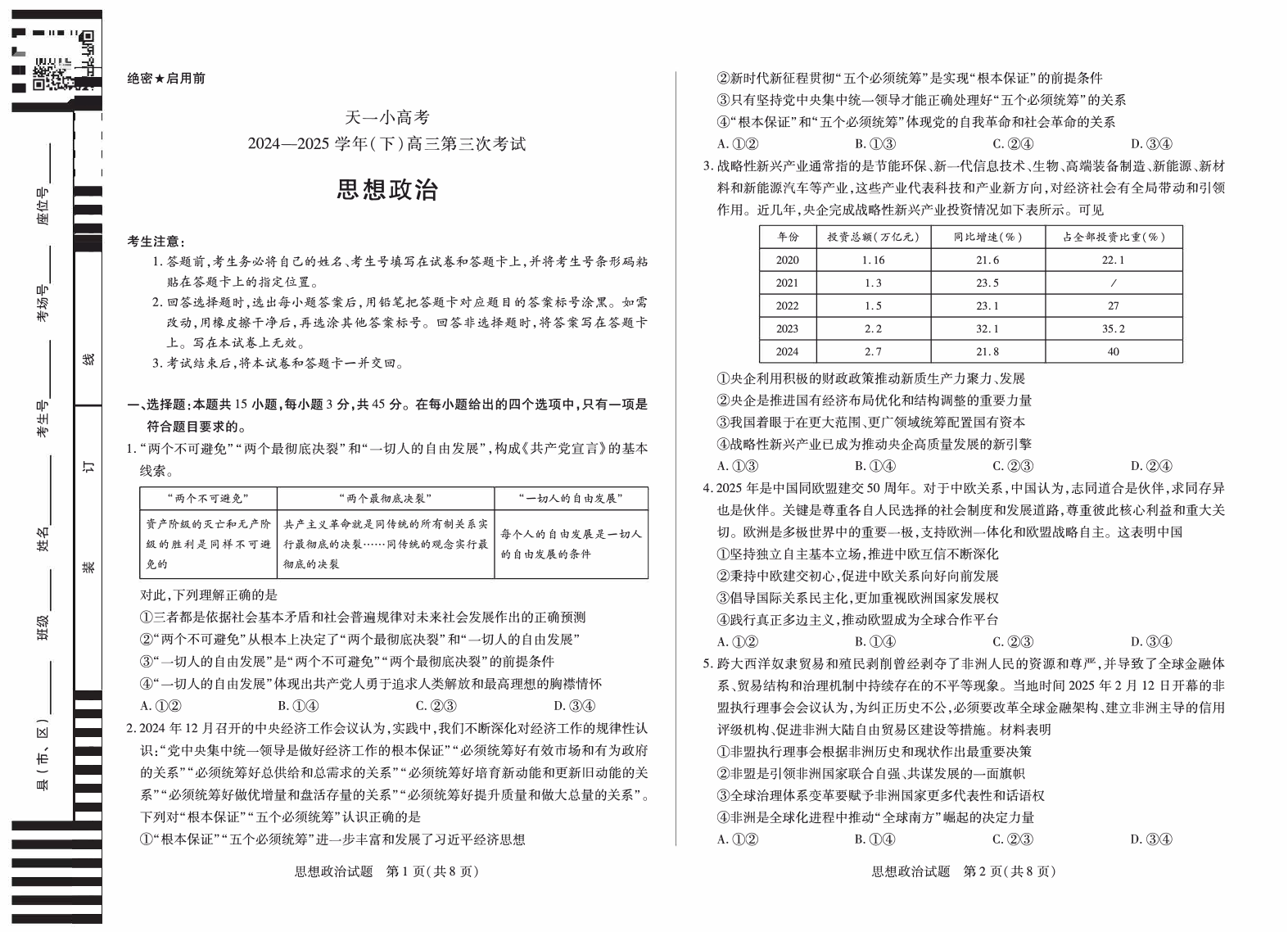 河南省天一小高考2024-2025学年(下)高三第三次考试政治