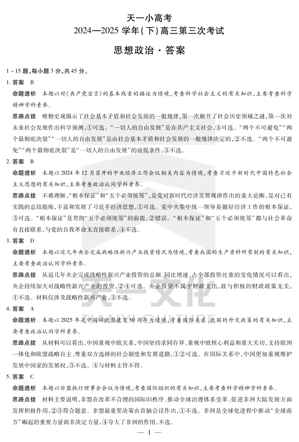 河南省天一小高考2024-2025学年(下)高三第三次考试政治答案