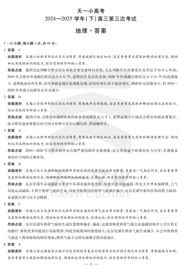 河南省天一小高考2024-2025学年(下)高三第三次考试地理答案