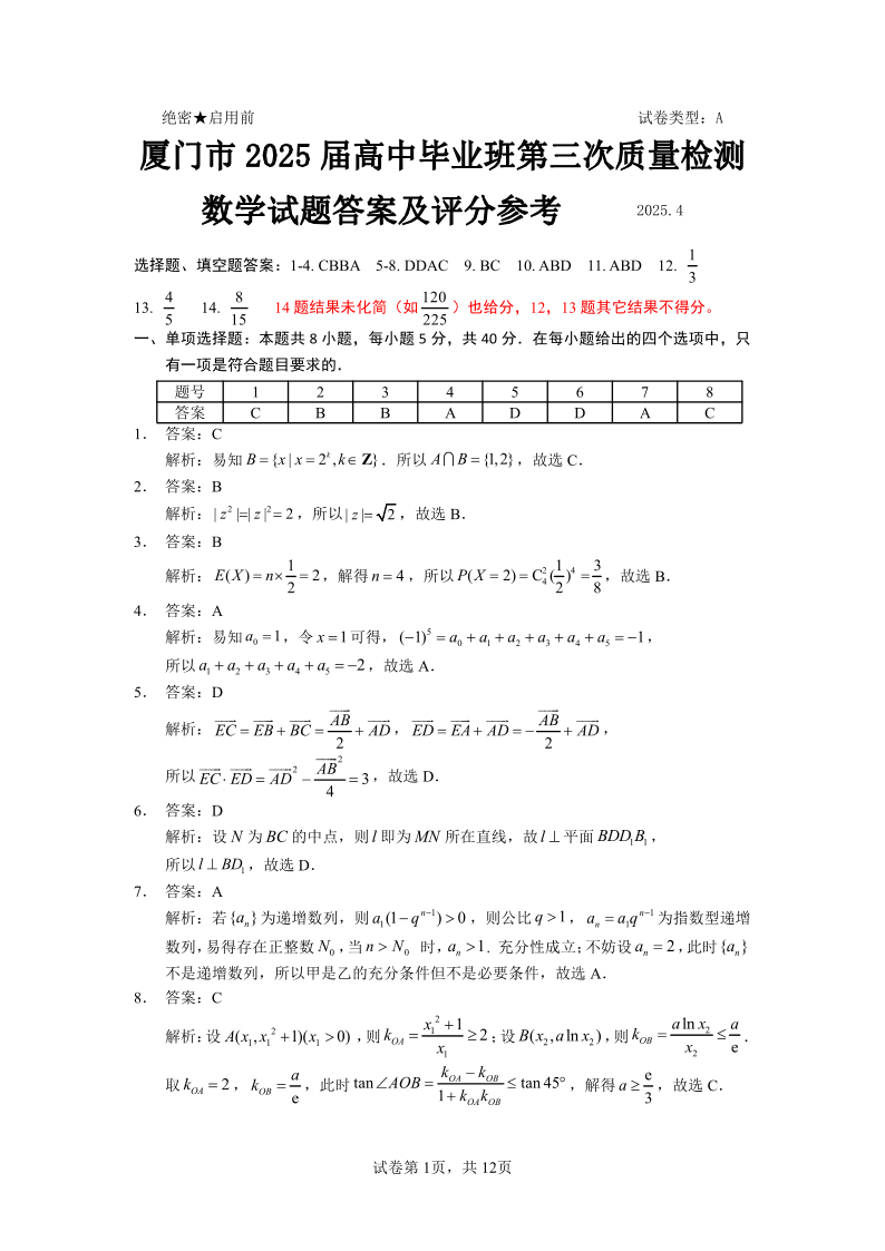 福建省九市2025届高中毕业班第三次质量检测(福建三模)数学答案