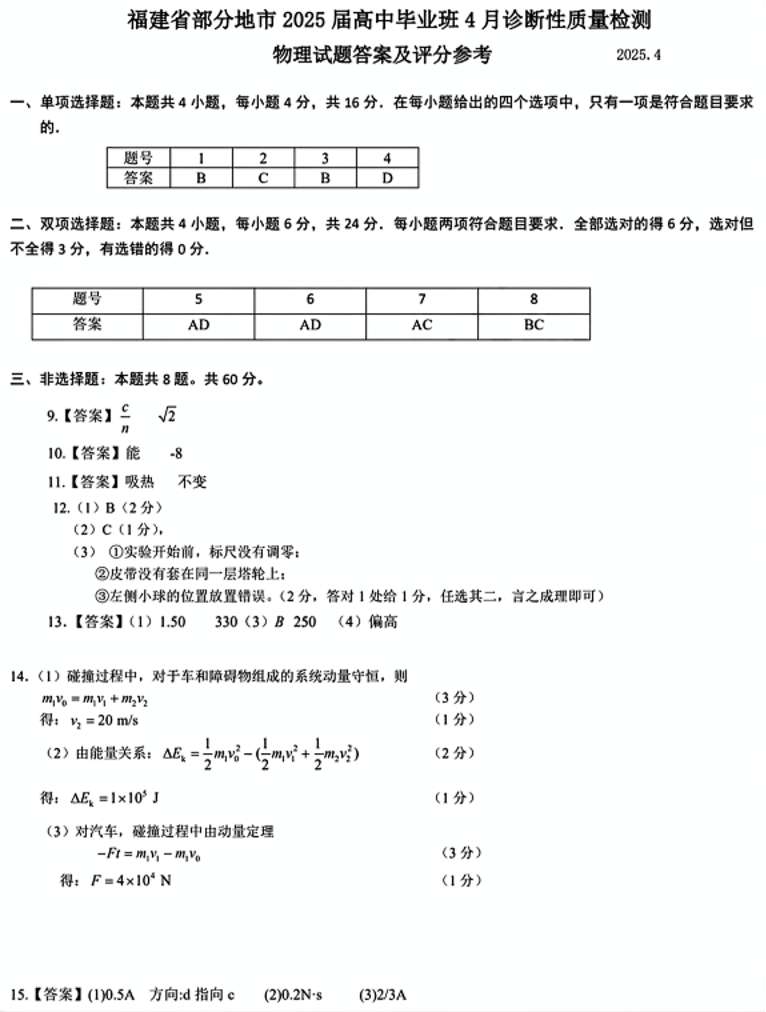 福建省九市2025届高中毕业班第三次质量检测(福建三模)物理答案