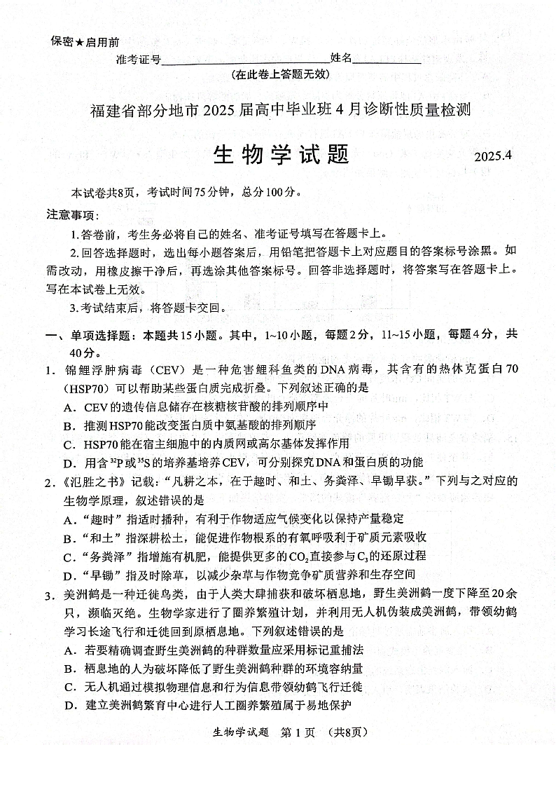 福建省九市2025届高中毕业班第三次质量检测(福建三模)生物