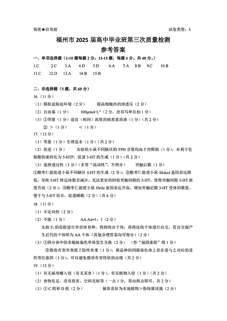 福建省九市2025届高中毕业班第三次质量检测(福建三模)生物答案