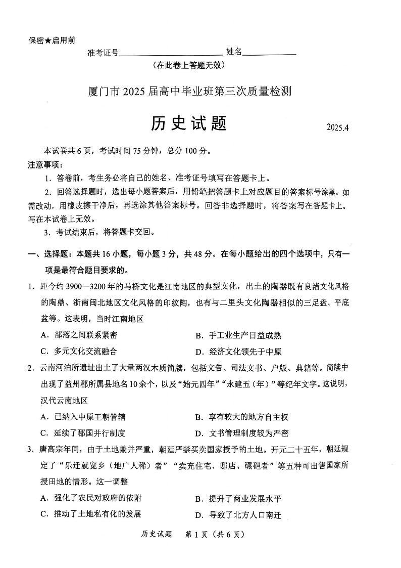 福建省九市2025届高中毕业班第三次质量检测(福建三模)历史