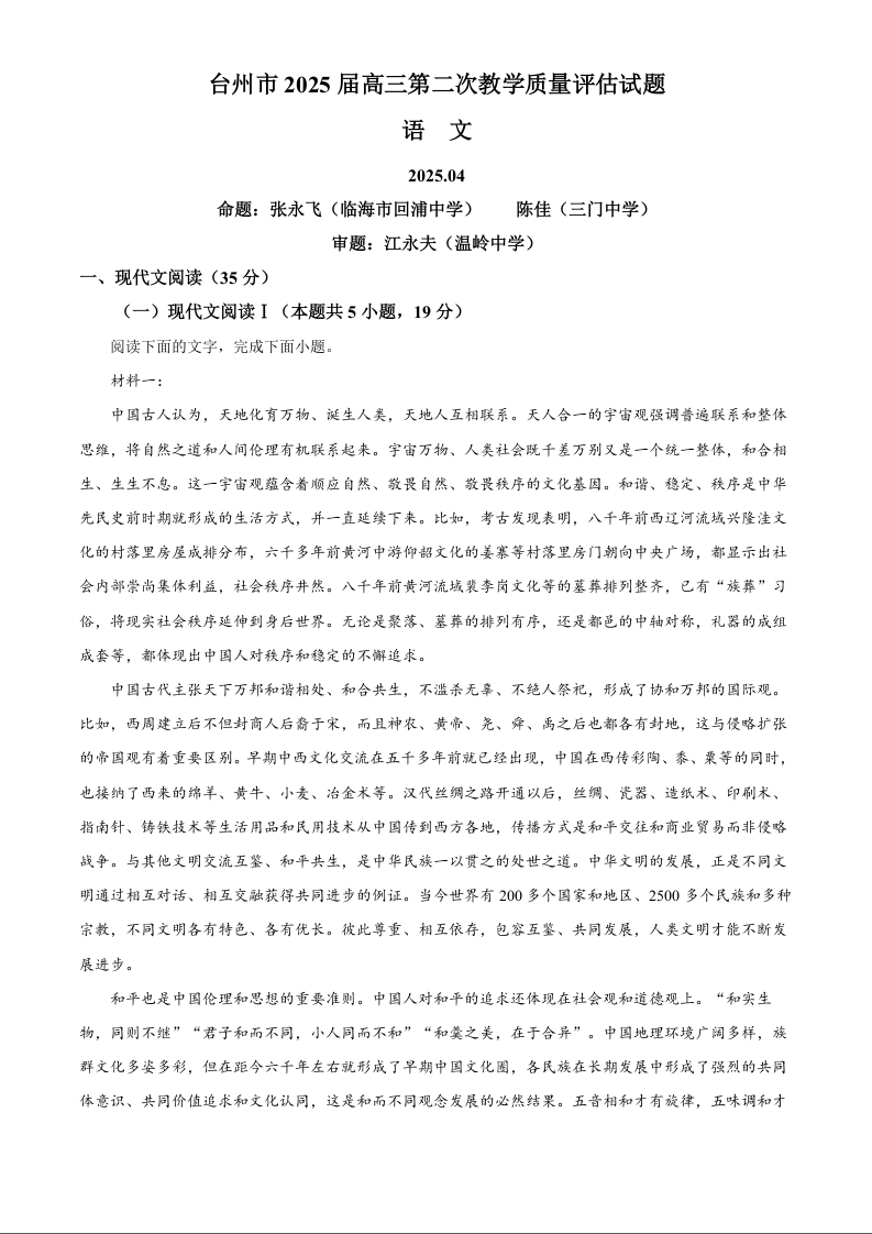 浙江省台州市2024-2025学年下学期高三二模质量评估语文(解析版)