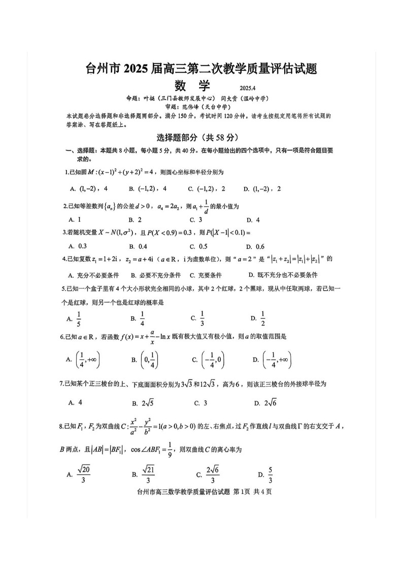 浙江省台州市2024-2025学年下学期高三二模质量评估数学+答案