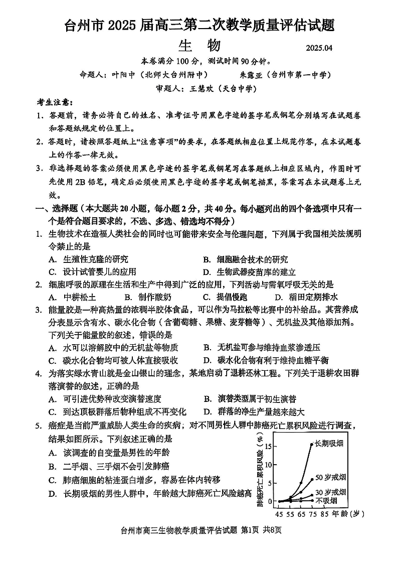 浙江省台州市2024-2025学年下学期高三二模质量评估生物+答案
