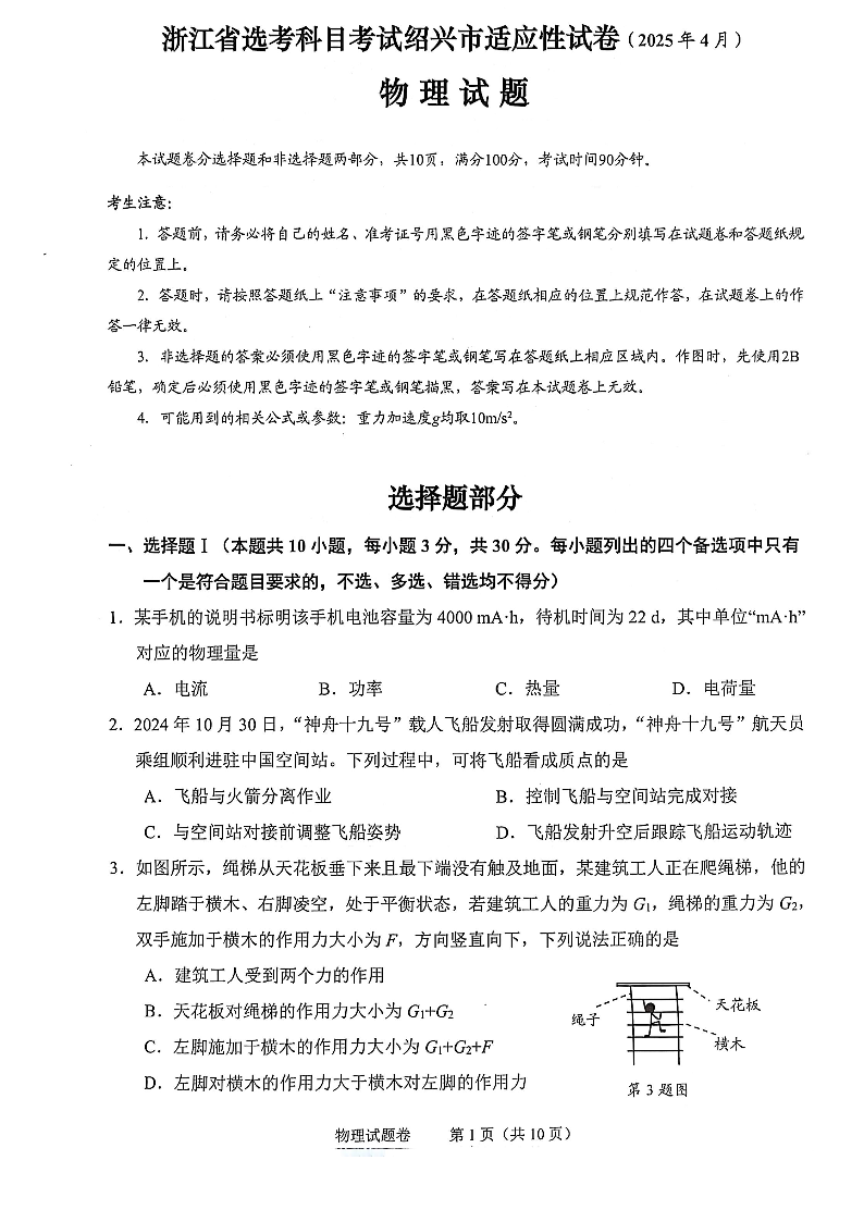 浙江省绍兴市2024-2025学年下学期4月高三二模测试物理+答案