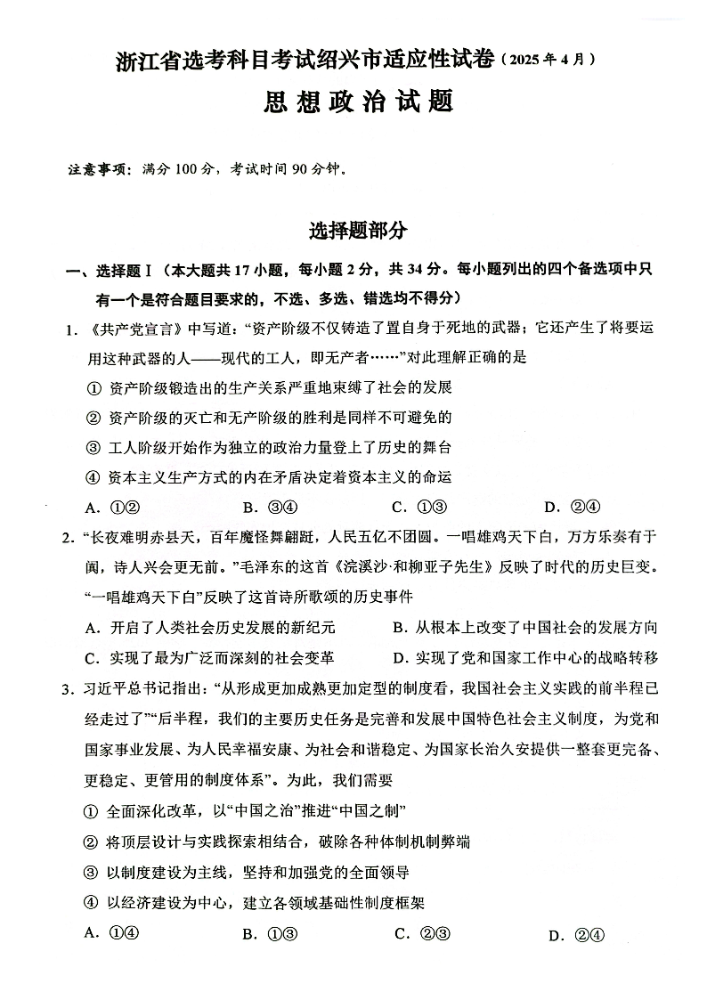 浙江省绍兴市2024-2025学年下学期4月高三二模测试政治+答案