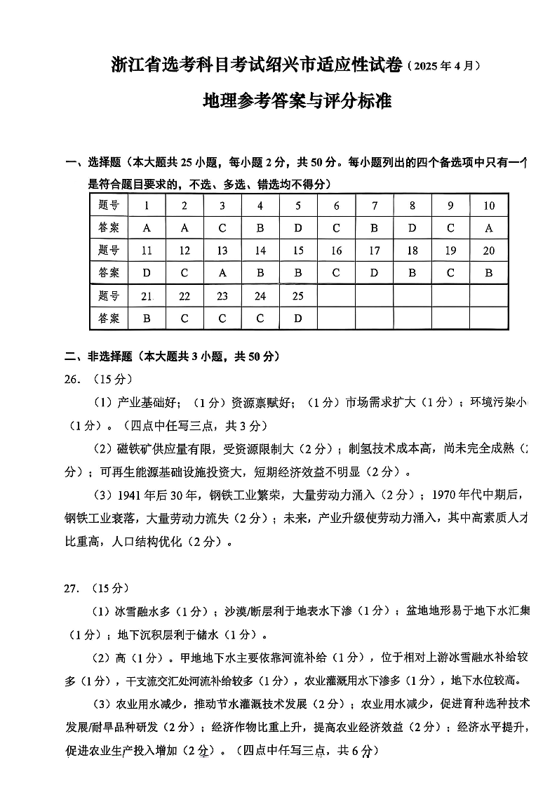 浙江省绍兴市2024-2025学年下学期4月高三二模测试地理答案