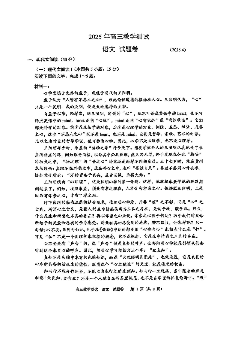 浙江省嘉兴市2024-2025学年下学期4月高三二模测试语文
