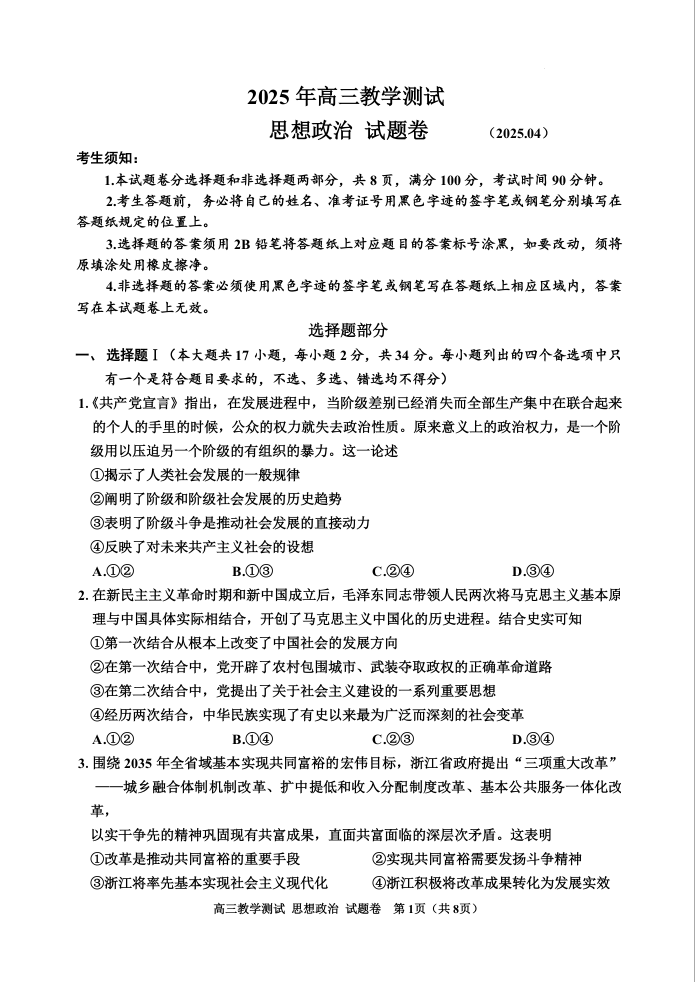 浙江省嘉兴市2024-2025学年下学期4月高三二模测试政治