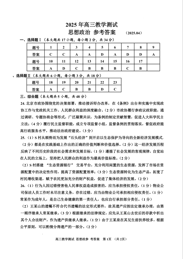 浙江省嘉兴市2024-2025学年下学期4月高三二模测试政治答案