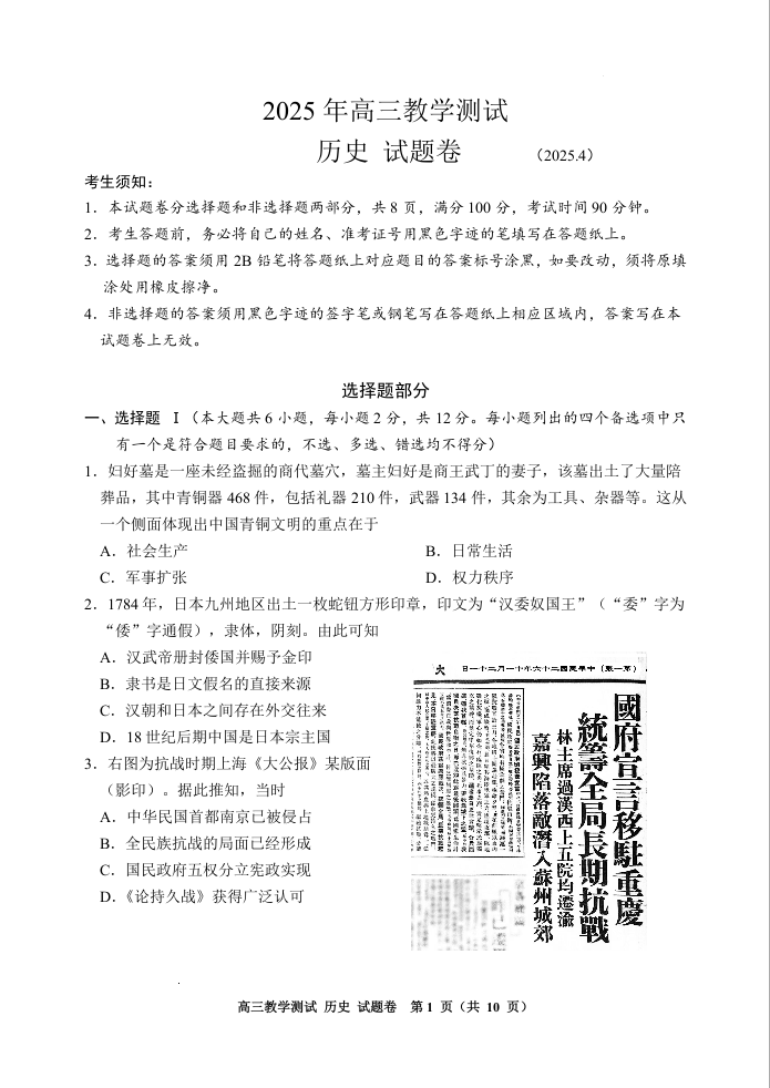 浙江省嘉兴市2024-2025学年下学期4月高三二模测试历史+答案