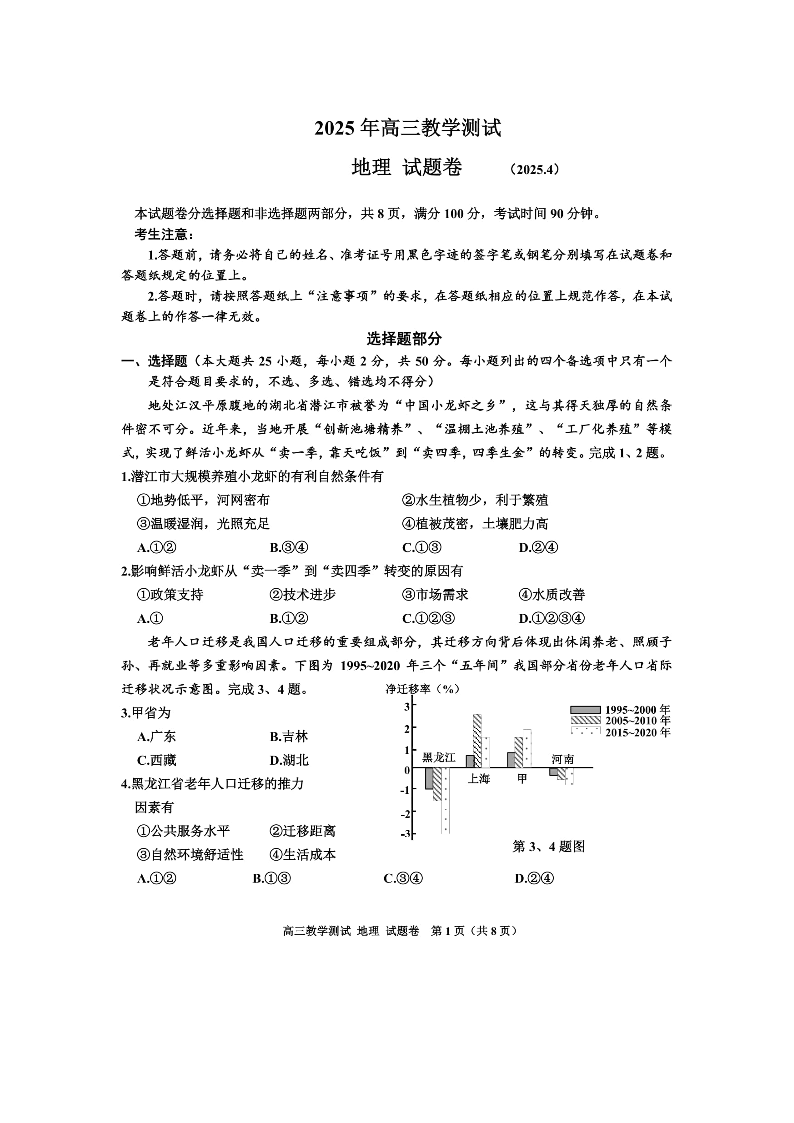 浙江省嘉兴市2024-2025学年下学期4月高三二模测试地理+答案