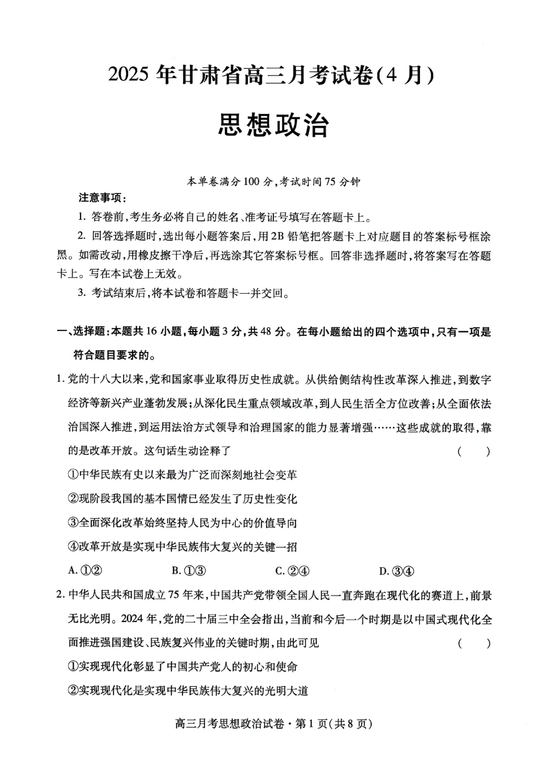 甘肃省2024-2025学年下学期4月高三二诊联考政治+答案