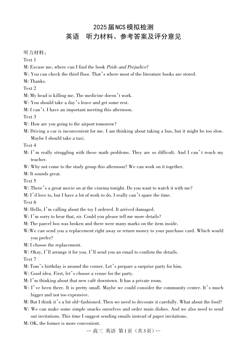 江西省南昌市2024-2025学年高三二模测试英语答案