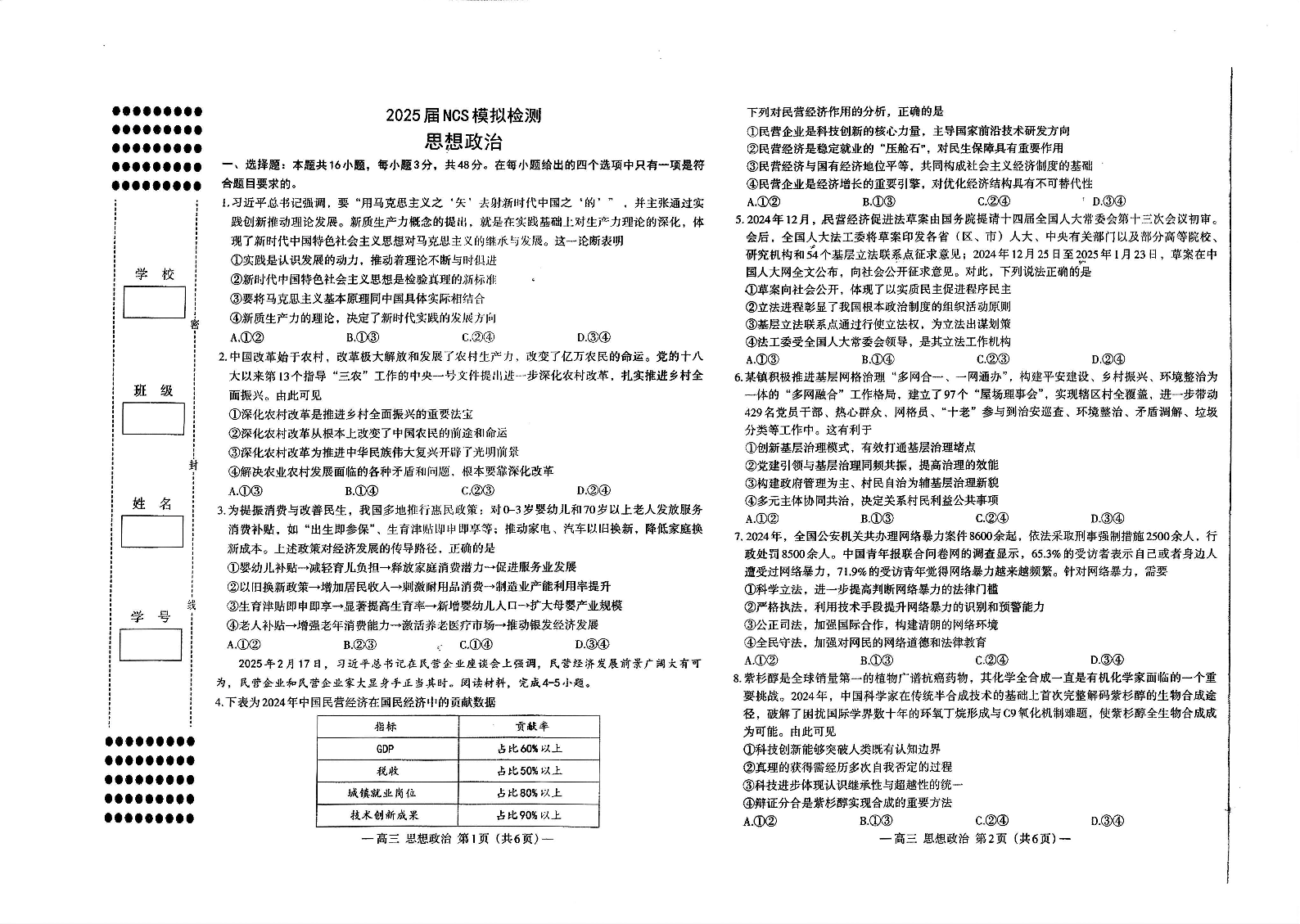 江西省南昌市2024-2025学年高三二模测试政治