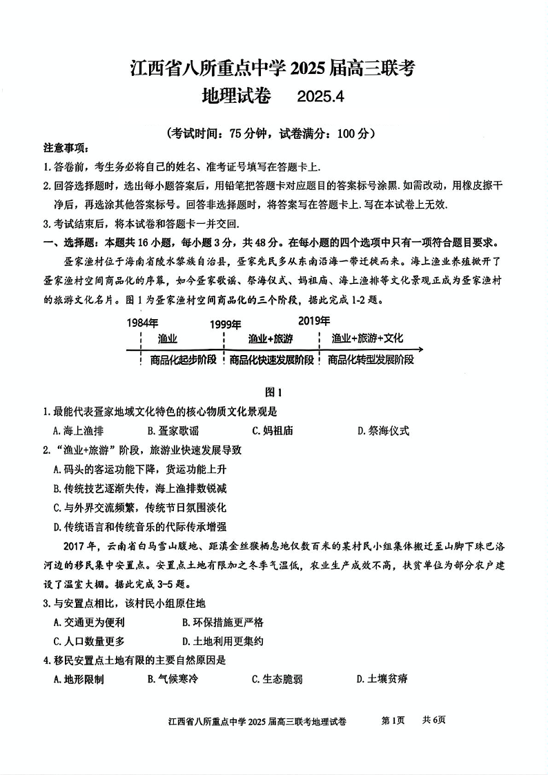 江西省八所重点校2024-2025学年下学期4月高三二模地理+答案