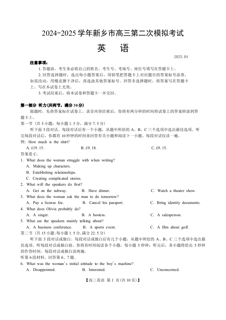 河南省新乡金太阳2025届高三第二次模拟英语+答案