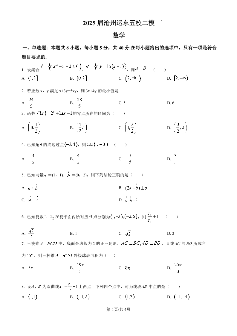 河北省沧州市运东五校2024-2025学年下学期高三二模数学(原卷版)