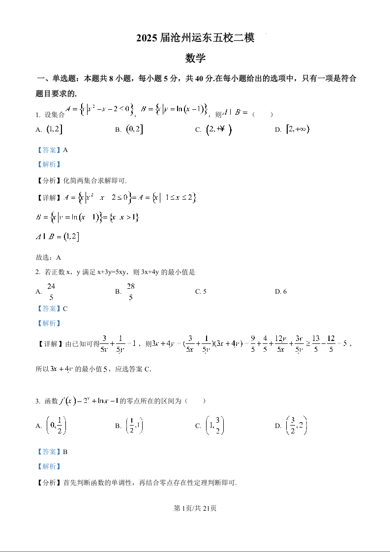 河北省沧州市运东五校2024-2025学年下学期高三二模数学(精品解析版)