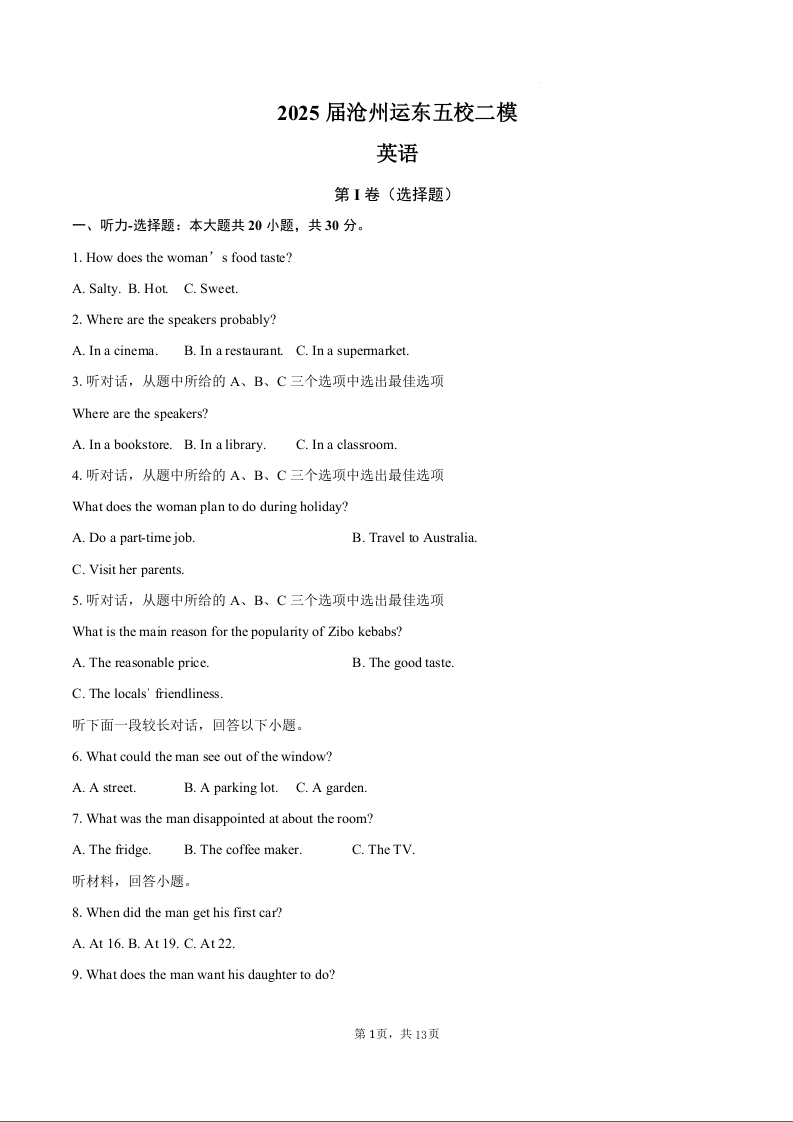 河北省沧州市运东五校2024-2025学年下学期高三二模英语+答案