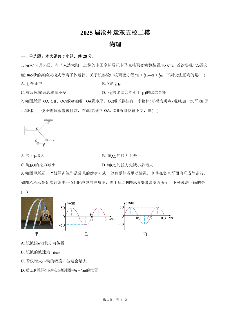 河北省沧州市运东五校2024-2025学年下学期高三二模物理+答案