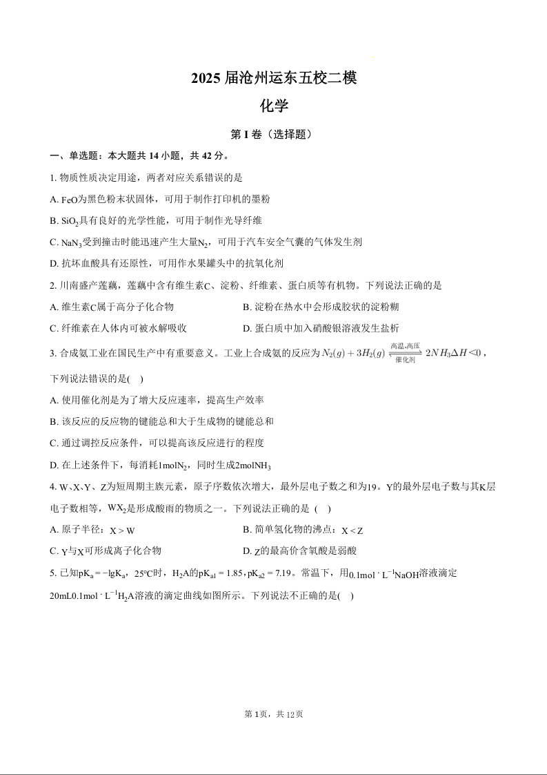 河北省沧州市运东五校2024-2025学年下学期高三二模化学+答案