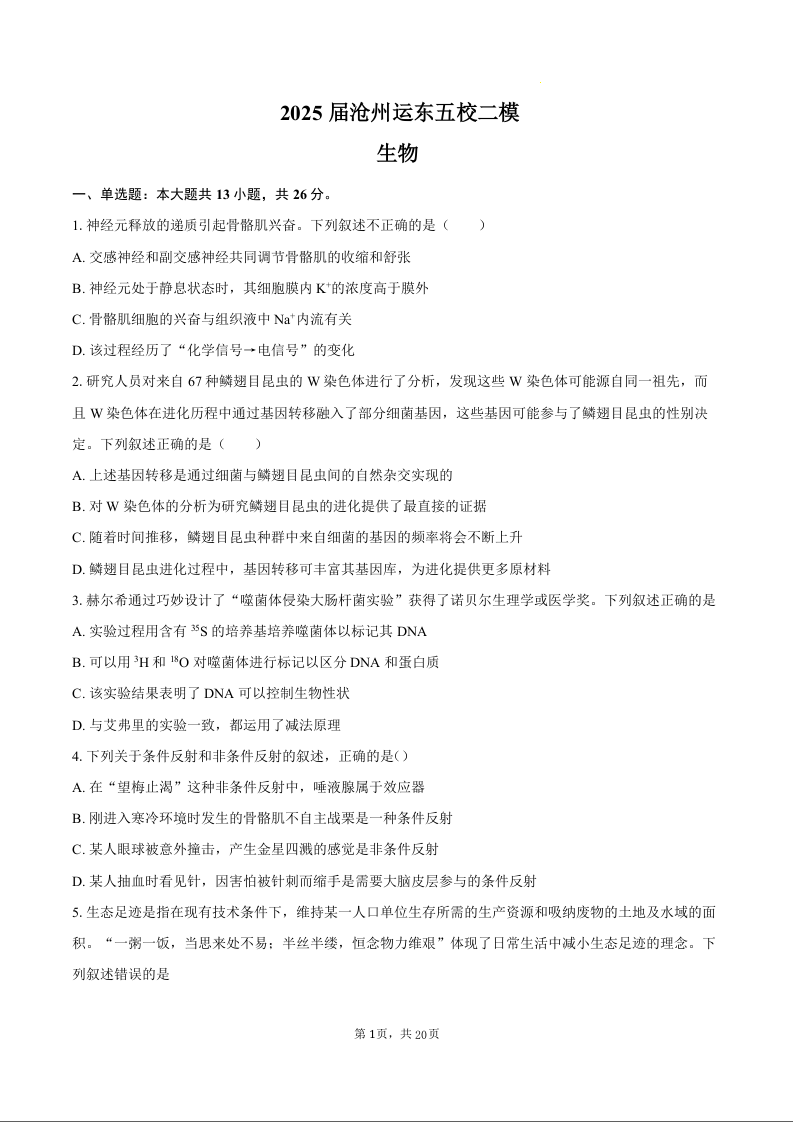 河北省沧州市运东五校2024-2025学年下学期高三二模生物+答案