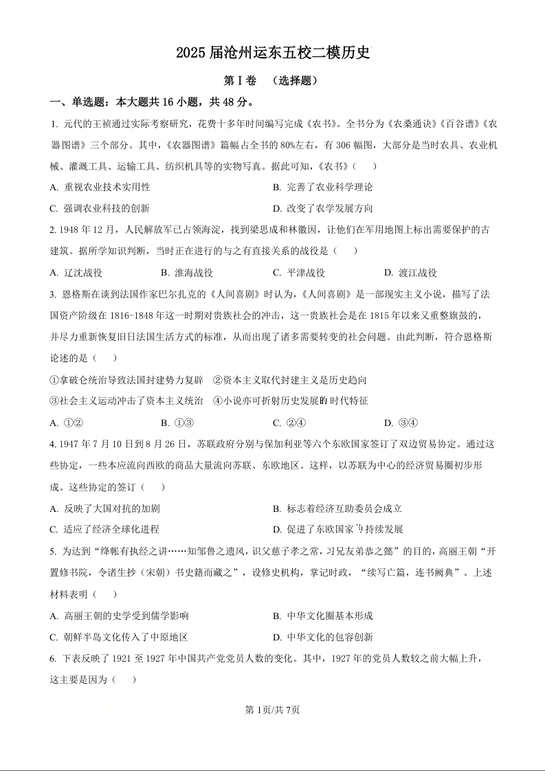 河北省沧州市运东五校2024-2025学年下学期高三二模历史(原卷版)