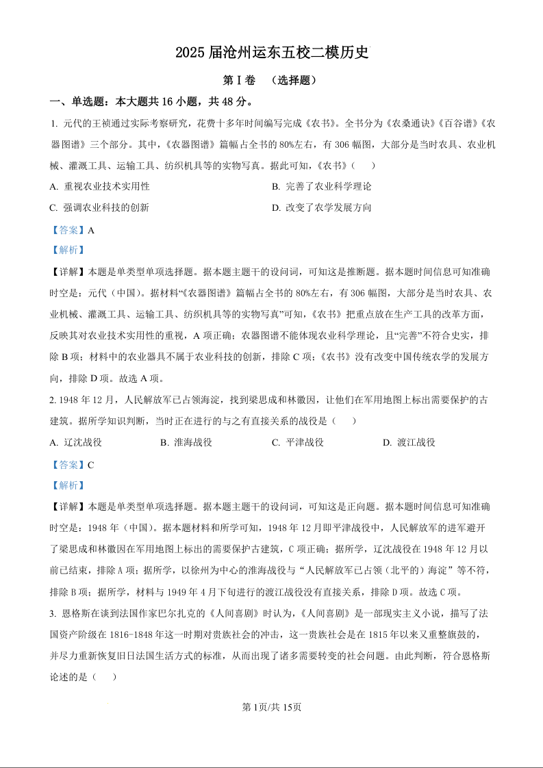 河北省沧州市运东五校2024-2025学年下学期高三二模历史(精品解析版)