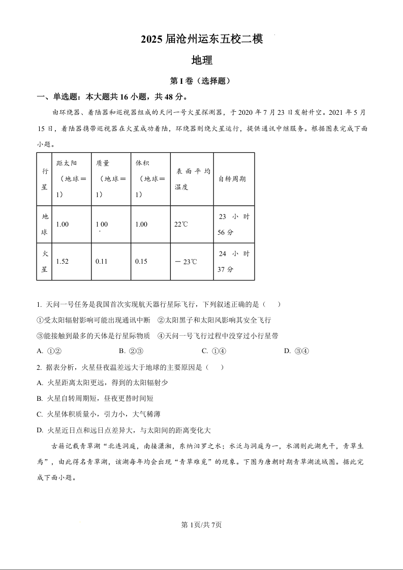 河北省沧州市运东五校2024-2025学年下学期高三二模地理(原卷版)