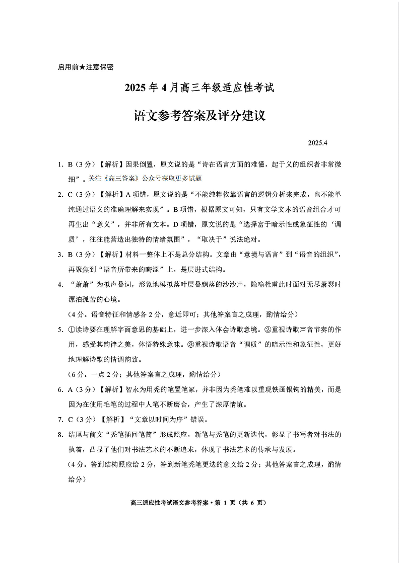 贵州省2024-2025学年下学期4月高三适应性考试语文答案