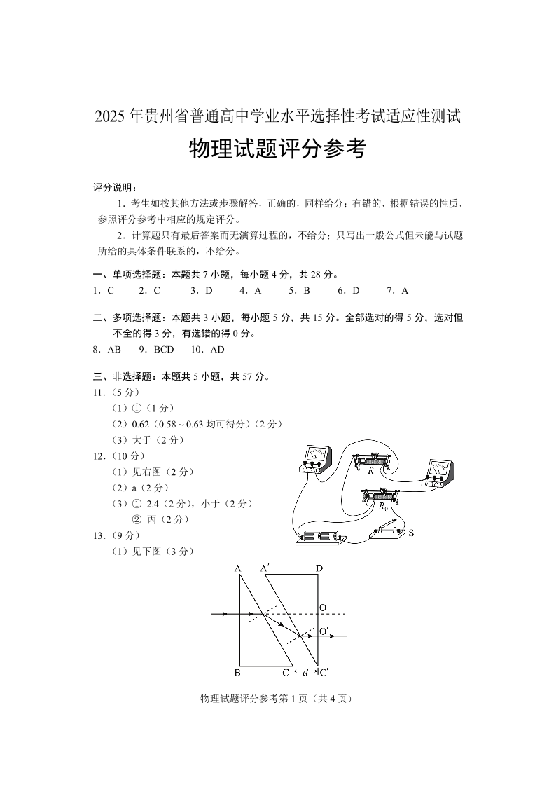 贵州省2024-2025学年下学期4月高三适应性考试物理答案