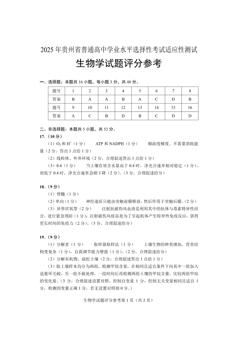 贵州省2024-2025学年下学期4月高三适应性考试生物答案