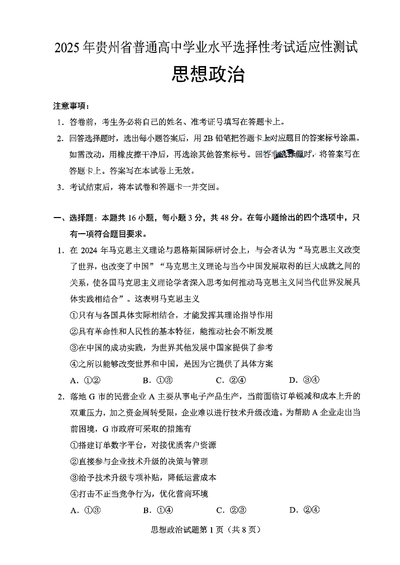 贵州省2024-2025学年下学期4月高三适应性考试政治