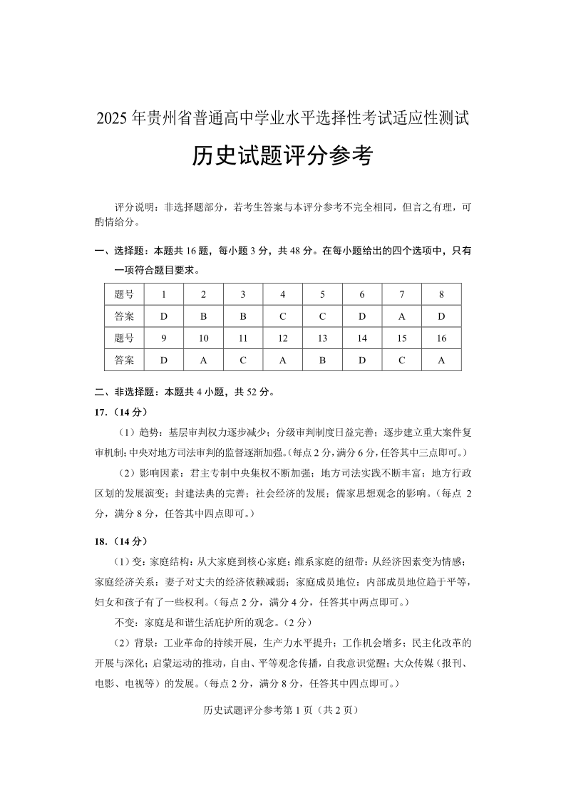 贵州省2024-2025学年下学期4月高三适应性考试历史答案