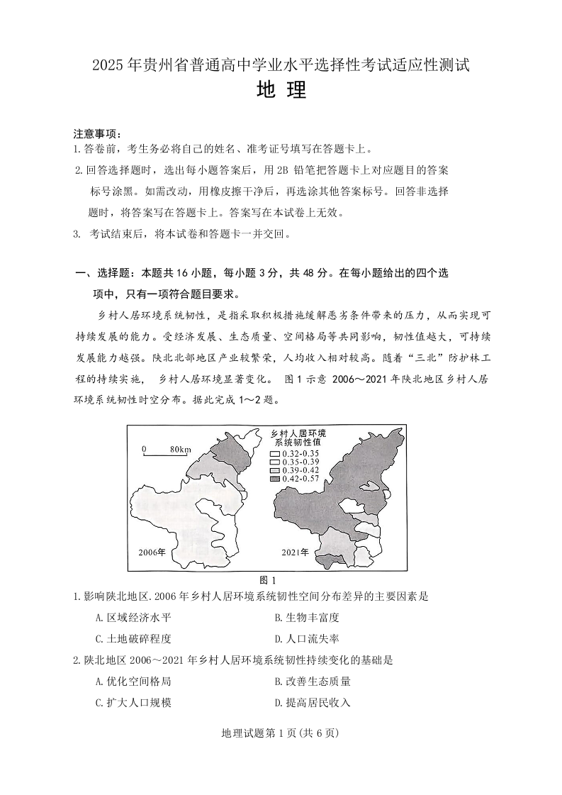 贵州省2024-2025学年下学期4月高三适应性考试地理