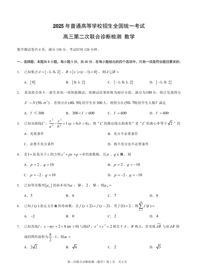 重庆市康德卷2024-2025学年全国高考高三二诊检测数学