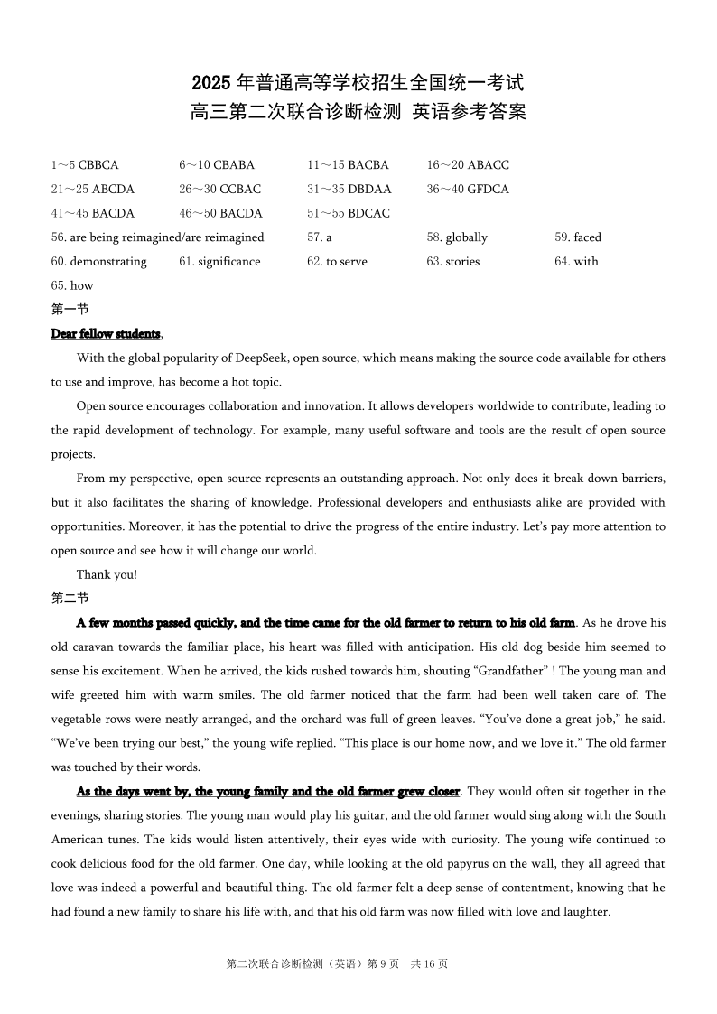 重庆市康德卷2024-2025学年全国高考高三二诊检测英语答案