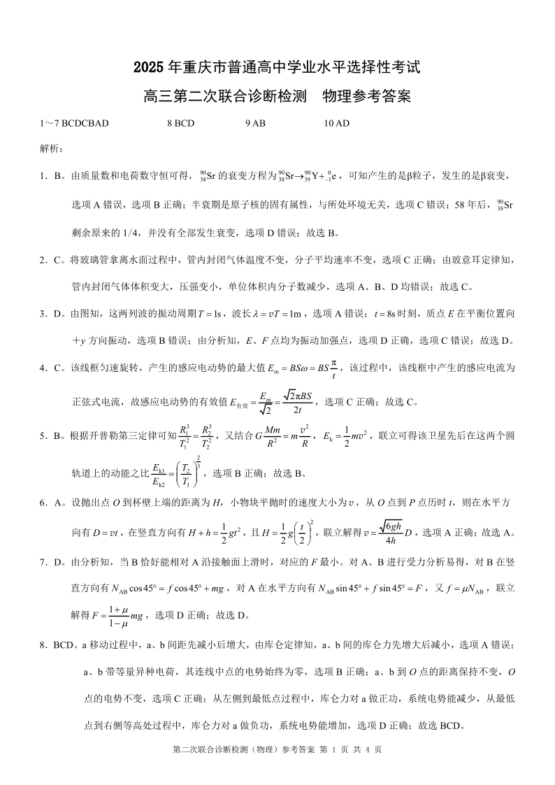 重庆市康德卷2024-2025学年全国高考高三二诊检测物理答案